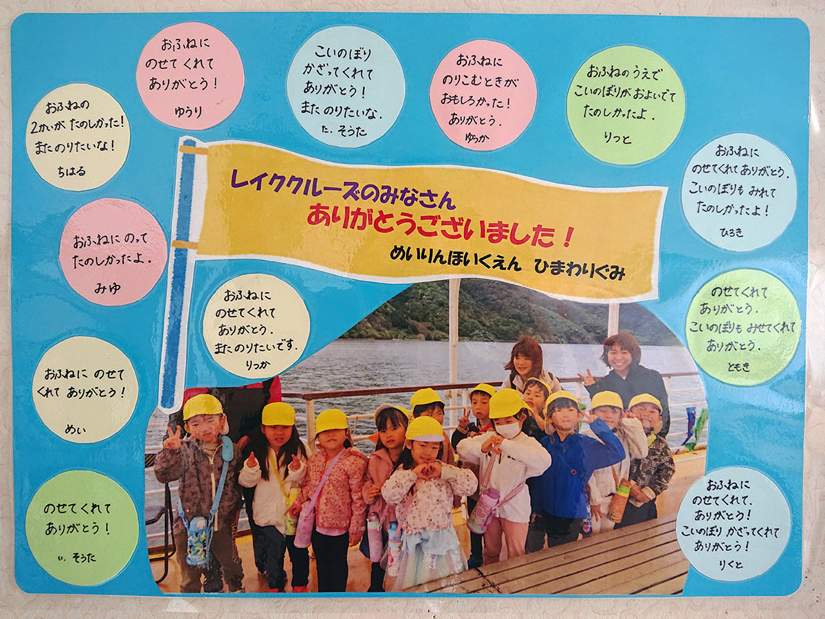 地域との連携2024.05.18 園児たちからのお礼メッセージ! レイククルーズ体験「三方五湖で鯉のぼり大作戦!2024」でご乗船いただいた園児たちより、お礼のメッセージが届きました。 「こいのぼりかざってくれてありがとう!」 「ふねにのるのがたのしかった。」 などなど、嬉しいメッセージばかりで、船長たちとニヤニヤしながら読ませていただきました。 このメッセージは観光船乗り場に掲示してありますので、ここに来ていただいた皆様にもぜひ見ていただきたいです! 本当にありがとうございました! 【団体様対象】年縞掘削現場見学クルーズのご案内